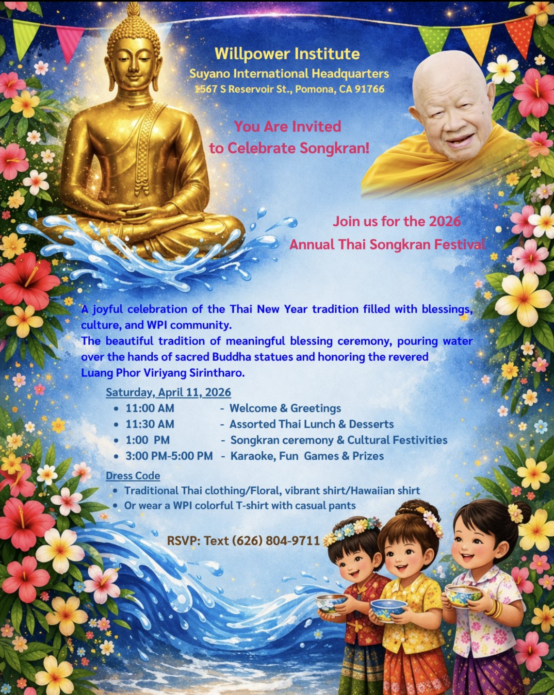 The Willpower Institute—Meditation Centers, with branches in the USA, Canada, and Thailand, was founded in 1997 by Luangphor Viriyang Sirintharo, a master teacher of meditation, who currently serves as Lord Abbot of the famous Dhammamongkol Temple in Bangkok, Thailand.